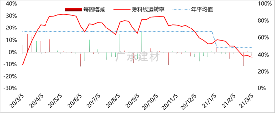 截至3月5日,调研水泥熟料企业开工率和产能利用率情况显示,全国水泥熟料企业开工率44.53%,较上周下降3.28%;熟料线运转率36.54%,较上周下降2.78%;水泥熟料产能利用率38.34%,较上周下降2.41%。