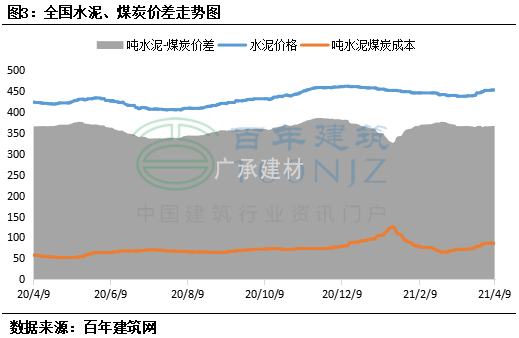 截至4月 9日,二季度水泥-煤炭价格差月度均值为366.73元/吨,同比2020年上涨0.29%。二季度进入传统水泥旺季,水泥价格持续上涨,港口动力煤价格保持快速上涨态势,为水泥价格提供一定支撑,二季度跌幅同比收窄,行业利润同比呈升态势。
