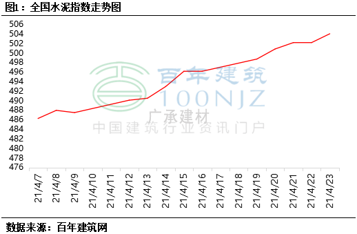 概述:本周全国熟料线运转率74.36%,较上周上升0.43%,全国平均熟料库容比为54.55%,较上周小幅下降0.89%,全国水泥价格涨跌互现,截止4月23日,水泥价格指数为504.01点,较上周496.15环比上涨1.58%。