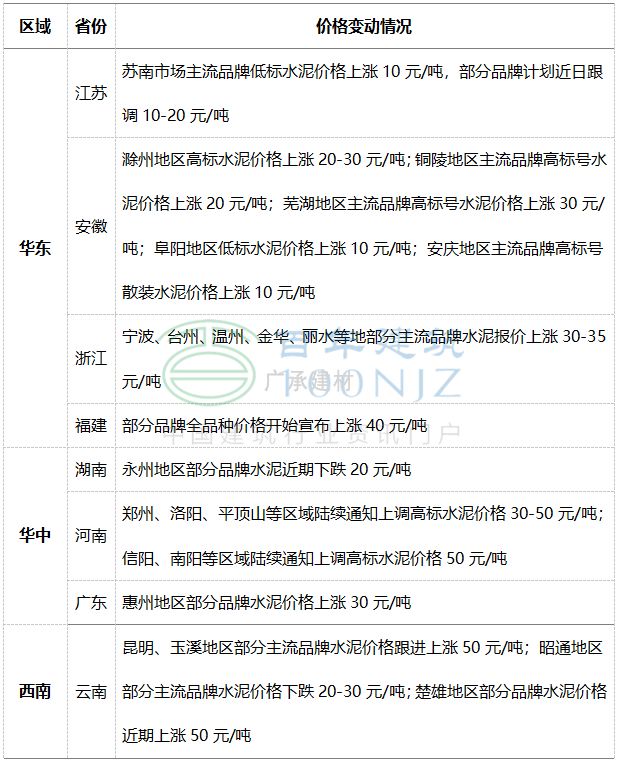 下周预测:本周华东市场行情价格强势上涨,预计下周华东地区水泥价格继续偏强运行;华北市场行情持稳运行,预计下周报价继续坚挺;西南地区水泥价格持续上涨,预计下周市场行情强势运行;东北地区水泥市场价格保持稳定,预计下周震荡偏强;华南部分地区行情持稳运行,预计下周市场行情稳中偏强;华中地区市场行情涨跌互现,预计下周震荡运行;西北地区行情保持坚挺,预计下周市场行情持稳运行。