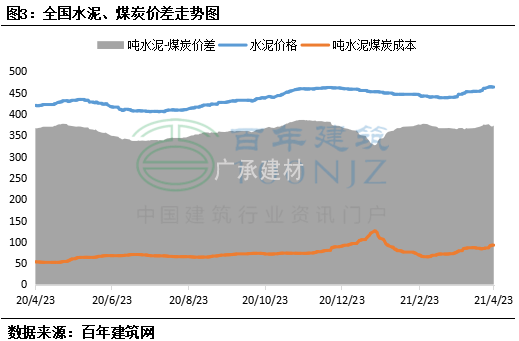 截至4月23日,二季度水泥-煤炭价格差月度均值为370.4元/吨,同比2020年上涨1.17%。二季度进入传统水泥旺季,水泥价格持续上涨,港口动力煤价格保持快速上涨态势,为水泥价格提供一定支撑,二季度跌幅同比收窄,行业利润同比呈升态势。