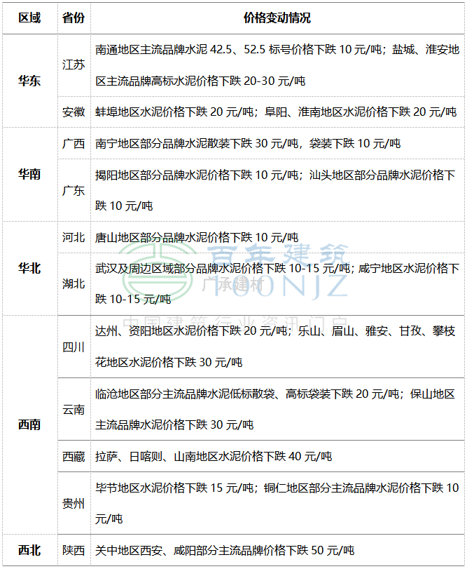 下周预测:本周华东市场行情价格继续走弱,预计下周华东地区水泥价格跌幅收窄;华北市场行情价格小幅下跌,预计下周报价弱稳;西南地区水泥价格大幅下跌,预计下周市场行情再度下行;东北地区水泥市场价格持稳,预计下周保持坚挺;华南部分地区水泥价格继续下跌,预计下周市场行情继续跟跌;华中地区市场价格持稳,预计下周市场行情小幅下跌;西北地区行情再度走弱,预计下周市场行情弱势运行。