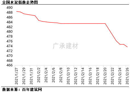 综合点评:截止2月26日,水泥价格指数为473.69点,较节前483.44下跌9.75个点,本周全国价格指数呈稳定趋势。具体走势情况如下: