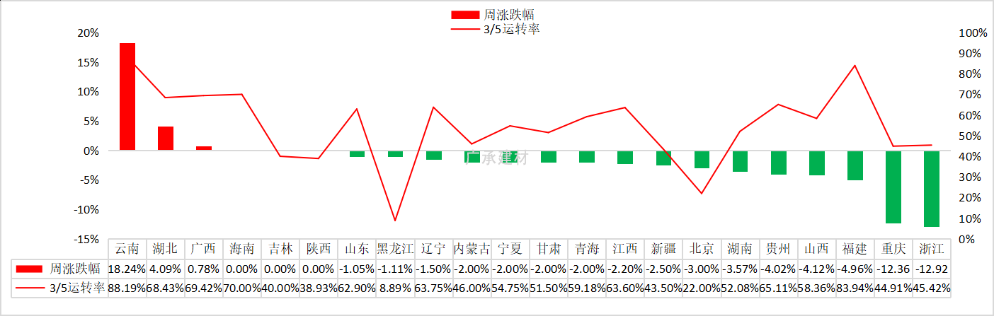 本周华中地区熟料库容比较上周上升5.50%,主要因为河南前期高窑线运转率,水泥需求不佳,熟料库存累库;西南地区熟料库容比较上周上升3.12%,主要因为云南、四川地区水泥企业逐步结束错峰生产,水泥产能释放,需求表现不佳,库存有所增加;华东地区熟料库容比较上周下降2.44%,目前华东整体窑线运转率较低,需求逐步恢复,库存回落;其他区域变动动。