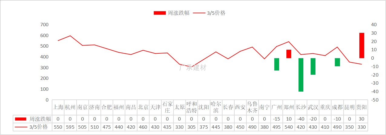 图5 重点城市水泥价格涨跌情况(单位:元/吨)