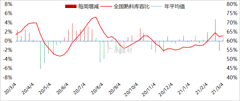 截至3月4日,调研水泥厂熟料库容比显示,全国平均熟料库容比为62.83%,较上周上升0.43%。