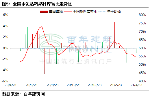 库存方面:本周全国平均熟料库容比为54.55%,较上周小幅下降0.89%。主要因为河南、湖北地区水泥市场需求旺盛,熟料消耗较快,库存持续下降;江苏、浙江和山东地区市场需求向好,熟料库存小幅下降。