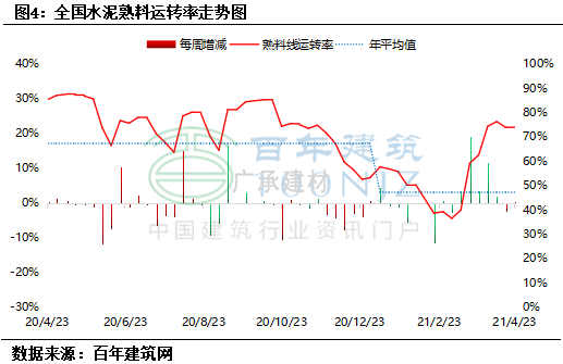 概述:本周全国熟料线运转率74.36%,较上周上升0.43%,全国平均熟料库容比为54.55%,较上周小幅下降0.89%,全国水泥价格涨跌互现,截止4月23日,水泥价格指数为504.01点,较上周496.15环比上涨1.58%。