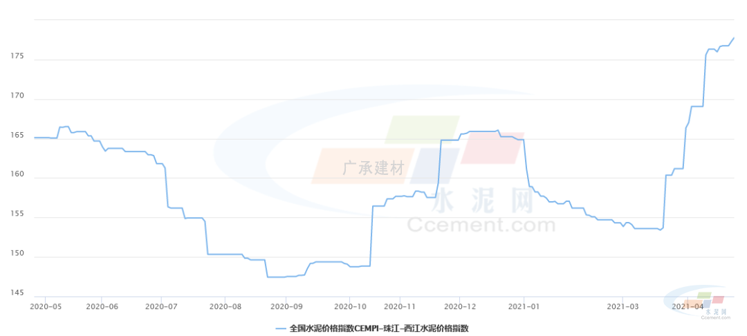 据中国水泥网发布的全国水泥价格指数CEMPI-珠江-西江水泥价格指数图中显示,自3月下旬开始,西江指数一路走高。