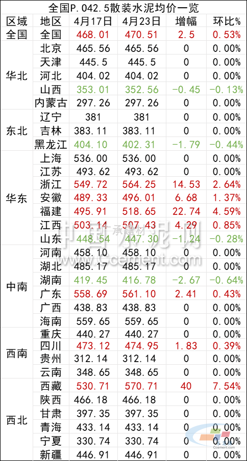 4月24日起区域一些主导企业通知上调水泥价格15-40元/吨,其中对部分价格偏低地区散装价格通知涨幅较大。