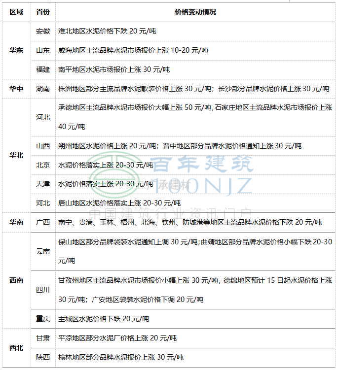 下周预测:本周华东市场行情价格涨跌互现,预计下周华东地区水泥价格震荡运行;华北市场行情强势上涨,预计下周报价继续偏强运行;西南地区水泥价格涨跌互现,预计下周市场行情偏弱运行;东北地区水泥市场价格保持稳定,预计下周持稳为主;华南部分地区行情小幅下跌,预计下周市场行情跌后持稳;华中地区市场行情小幅上涨,预计下周继续涨后持稳;西北地区行情陆续上涨,预计下周市场行情偏强运行。