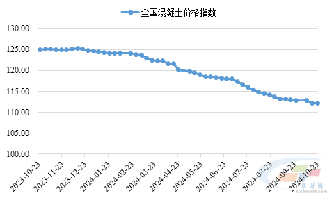 10月17日至10月23日,全国混凝土价格指数报收112.14点,环比下跌0.02%,同比跌幅为10.65%。分地区来看,广西局部混凝土价格下调5元/方,国内其他省市混凝土价格继续保持平稳运行。